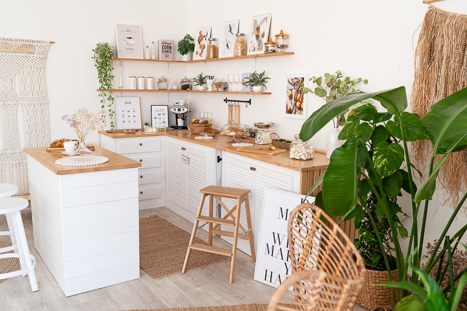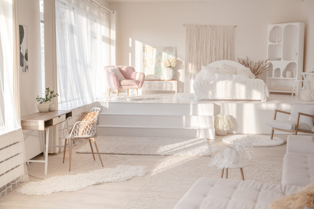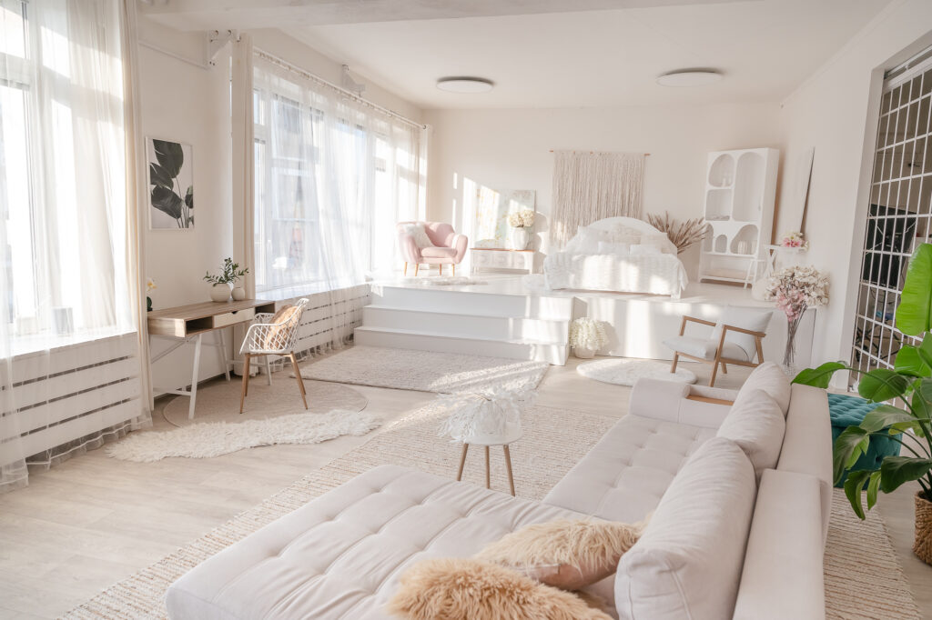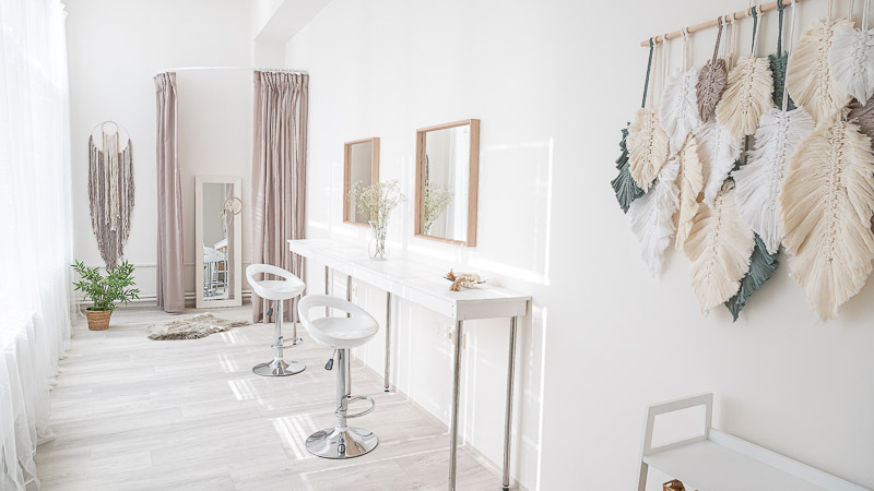 - Two distinct studios under one roof: a spacious boho-style studio (124 m²) and a minimalist studio (36 m²)