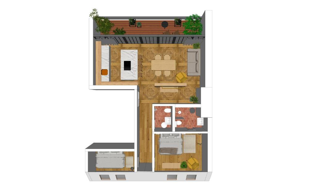 - Private terrace with wooden decking and greenery